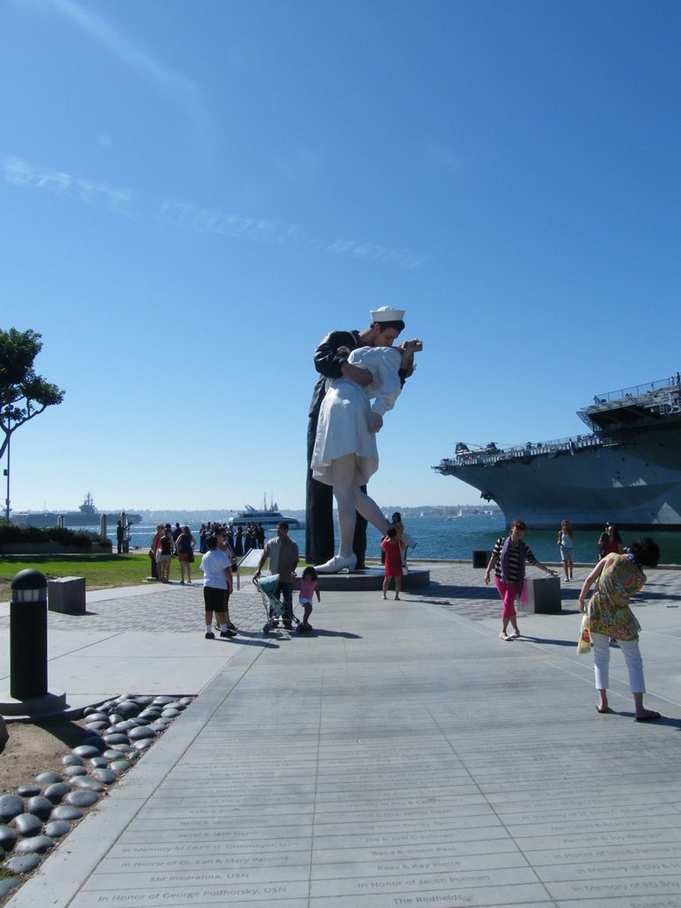 ... é também no passeio marítimo que fica o porto de navios de cruzeiro e o  USS Midway Museum, o museu naval instalado no porta-aviões que esteve mais tempo ao serviço da marinha norte-americana. Em frente ao navio está o original da famosa estátua gigante " Incondicional rendição" que retrata a foto tirada por Victor Jorgensen, do beijo entre um marinheiro e uma enfermeira, no final da Segunda Guerra Mundial... :)